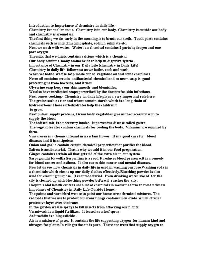 Chemistry involves more than the mere fact that that it entails the making of new combinations of chemical chemistry in daily life essay. It makes new combinations of industries and brings together different countries besides the chemical elements. It brings international competition, which results into the development of international cooperation. Chemistry improves everyday life of millions of people around the globe. It helps in the protection of the environment, development of new live saving, medicine, design new materials for cars, electronics as well as medical implants, chemistry in daily life essay.