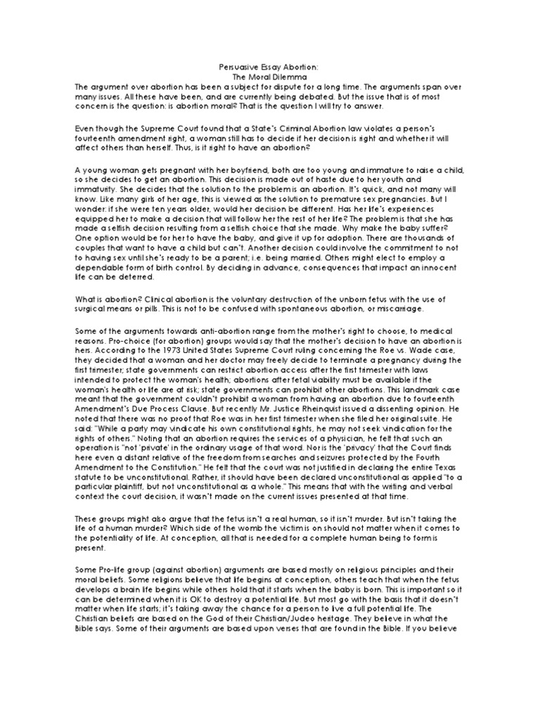 Essay Examples. Should women be allowed to have an abortion under certain circumstances? Should a woman be allowed to have an abortion when she got pregnant desirably? This issue is a very controversial matter that many people have debated about. Along with the debates, many laws were also formed to govern the legality of this matter. There are many reasons for a mother to choose abortion, essays about abortion, but the cause of rape and health Is only essays about abortion percent of all the abortion cases. There are many pros and cons toward this controversial issue. The cons of abortion are mostly argued with pro-life matters.